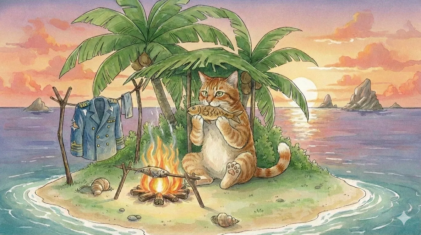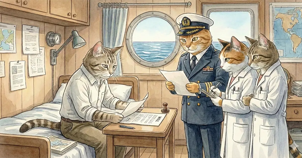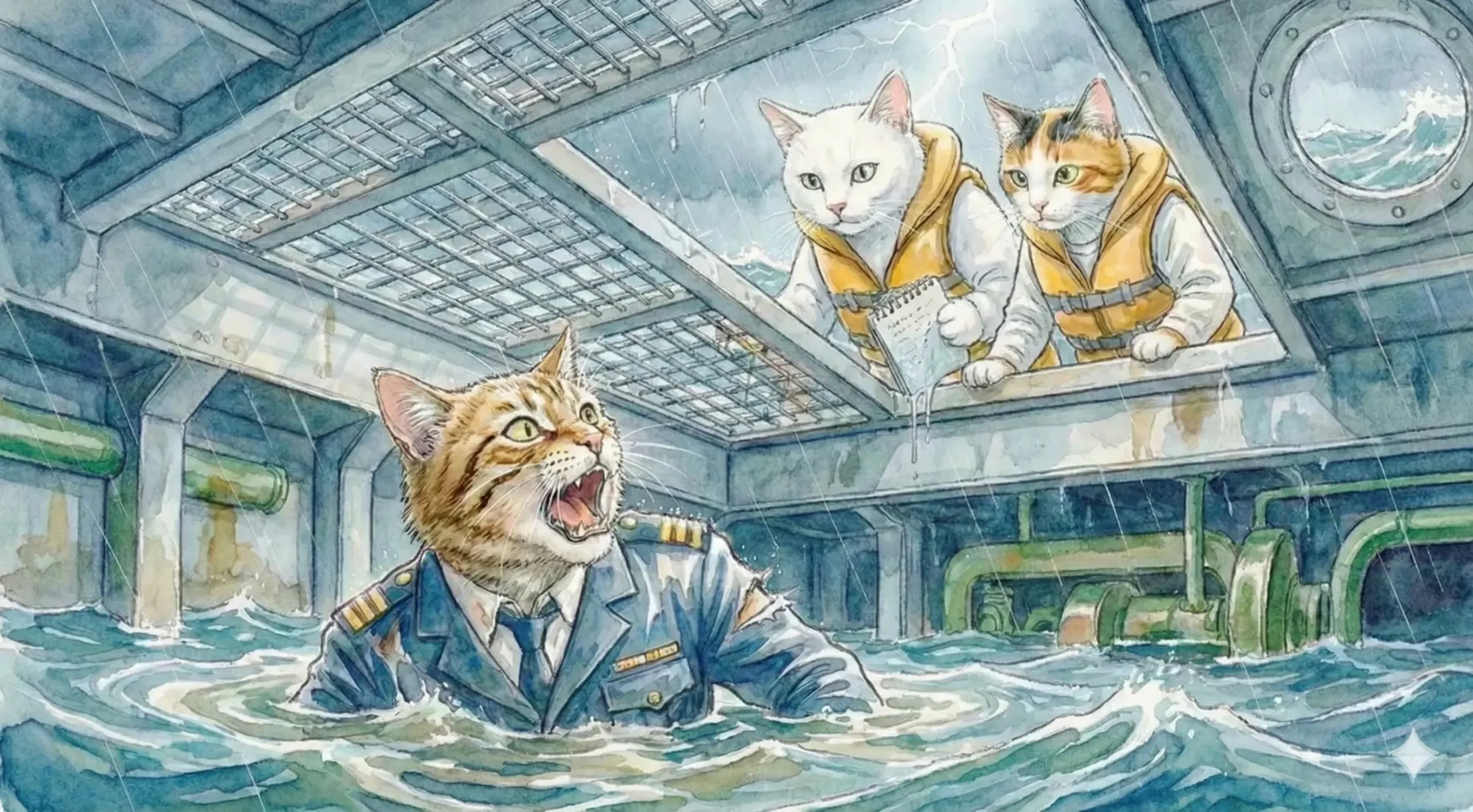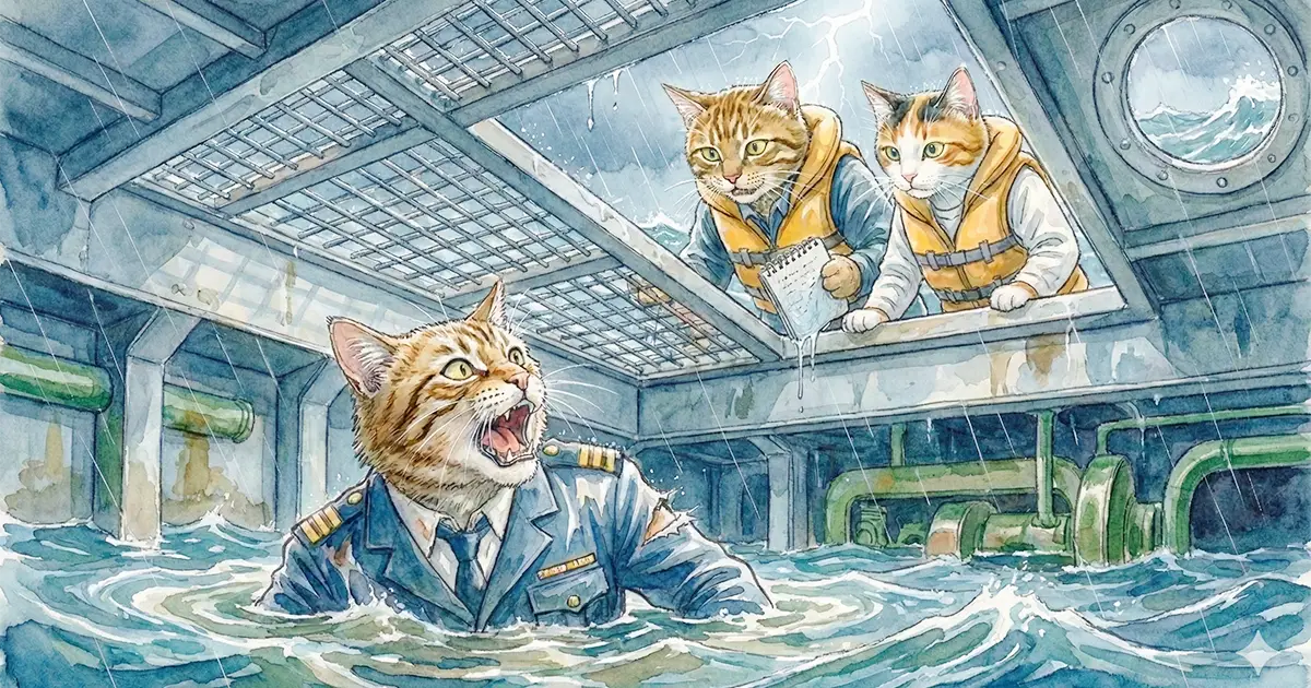 船長の猫岩 剛(ねこいわ つよし、58歳)は、総員退船を命じ、ほとんどの乗組員が脱出できました。しかし、最後まで避難誘導やけが人の救助をしていた猫岩船長は、浸水が始まっている船の下層部分に転落して大怪我を負ってしまい、脱出はもはや絶望的でした。